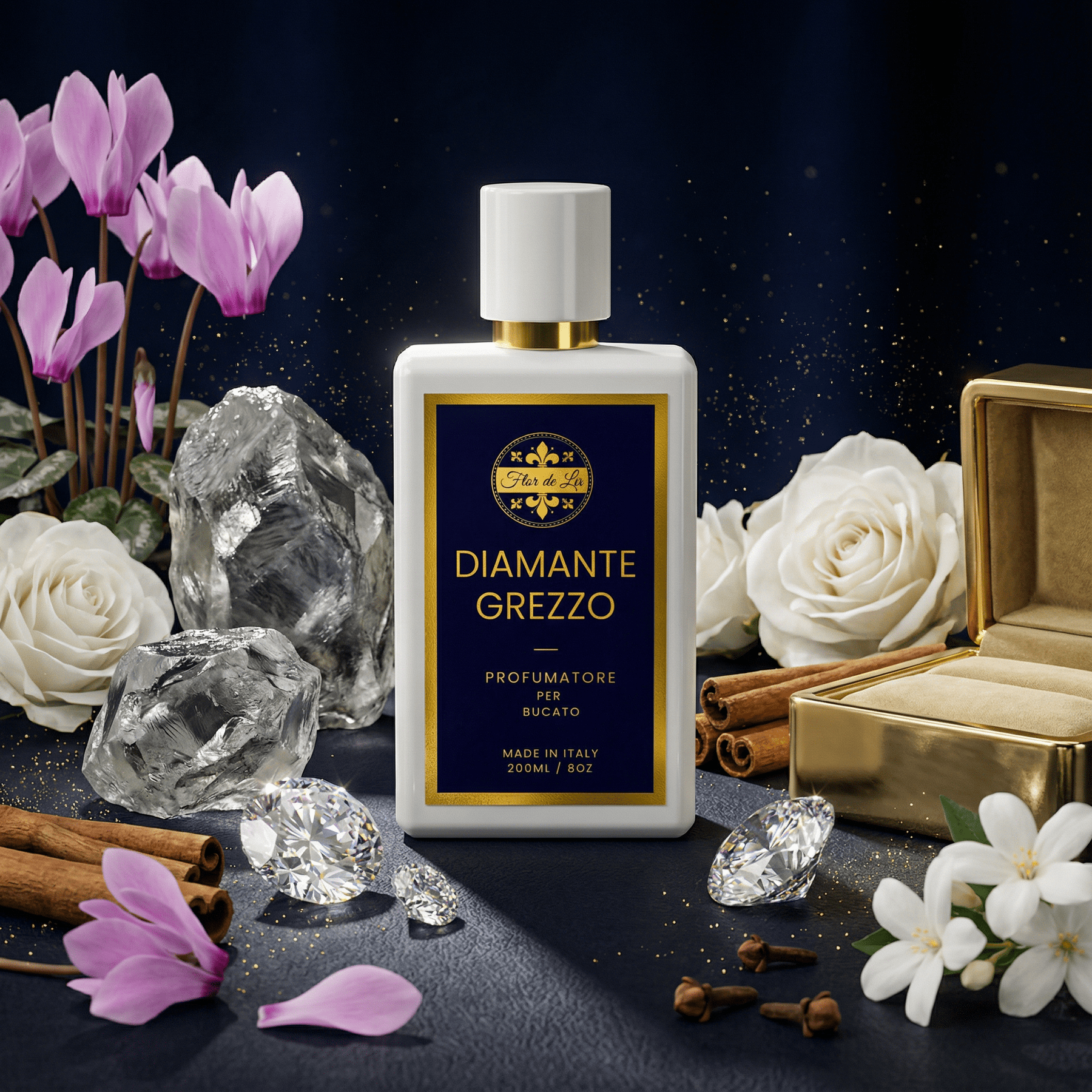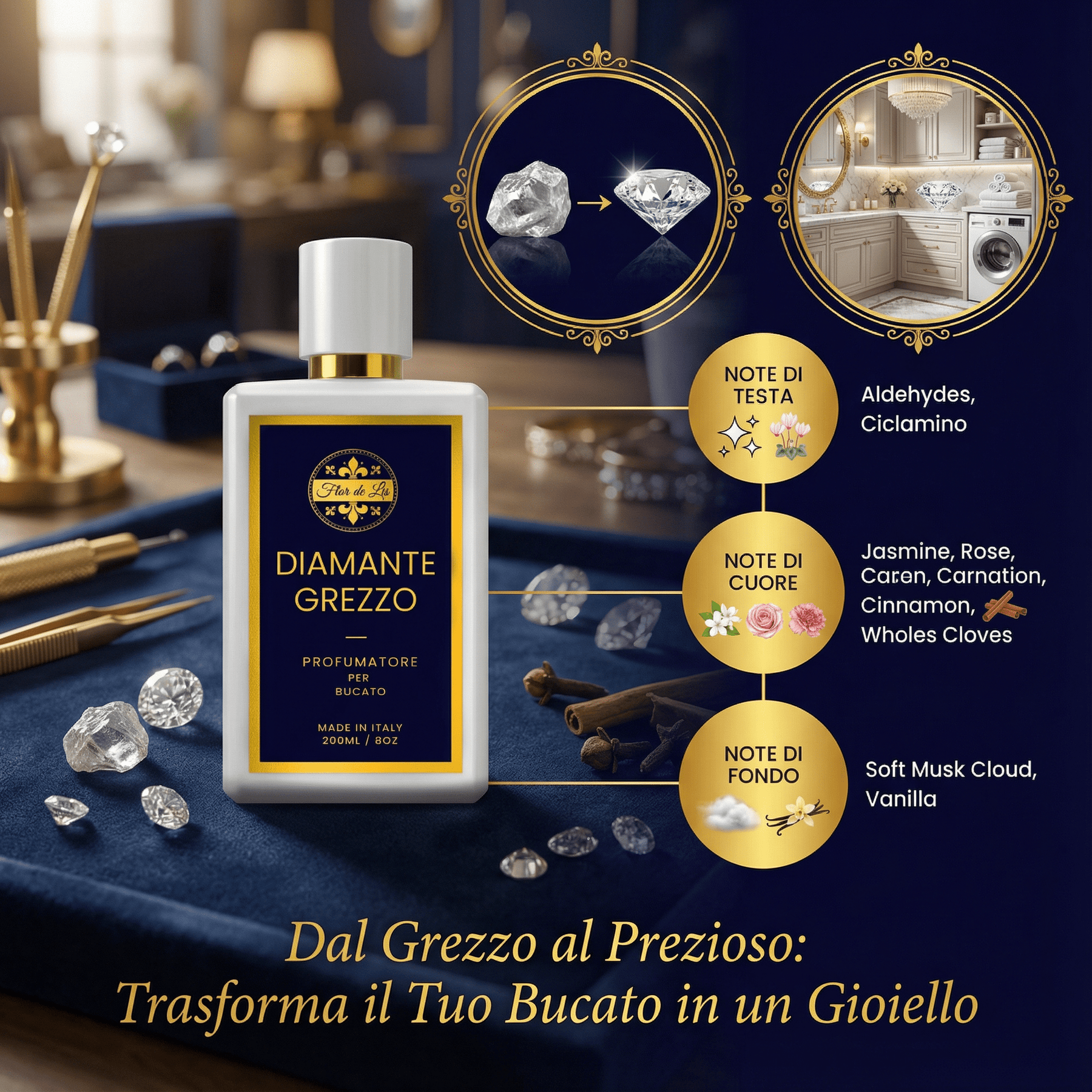 Scopri Diamante Grezzo, il profumatore per bucato creato dai nostri più rinomati nasi profumieri, pensato per regalare ai tuoi capi un’essenza unica e raffinata, come un prezioso gioiello nascosto. Ogni goccia di questo profumo trasforma il tuo bucato in un'esperienza sensoriale esclusiva, combinando arte e lusso in ogni fibra dei tuoi capi.